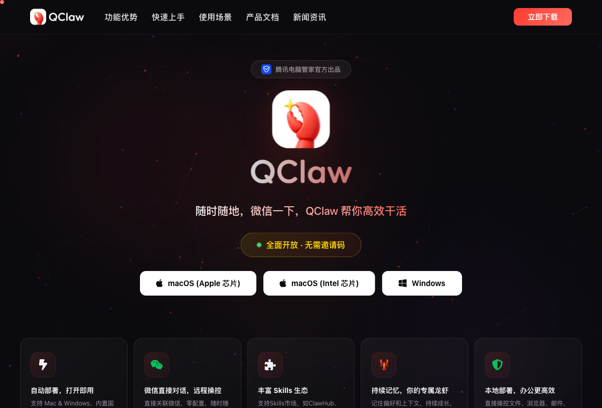 QClaw 是腾讯电脑管家团队基于 OpenClaw 打造的本地 AI 智能体助手,主打微信远程操控电脑。下载安装仅需20秒,扫码绑定微信即可用手机指挥电脑干活,是目前唯一深度集成微信的 AI Agent 产品。