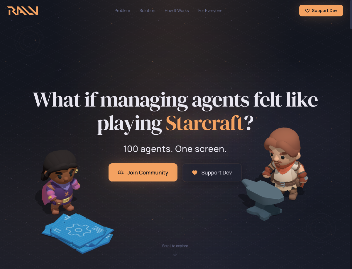 独特优势 唯一用3D空间+RTS游戏机制做代理编排的产品。竞品AgentCraft(最接近的竞争者)偏向开发者和2D界面,Ralv瞄准更广的「CEO指挥数字劳动力」定位。120 FPS的Electron渲染(从Tauri切换获得双倍帧率)保证了3D体验的流畅性。