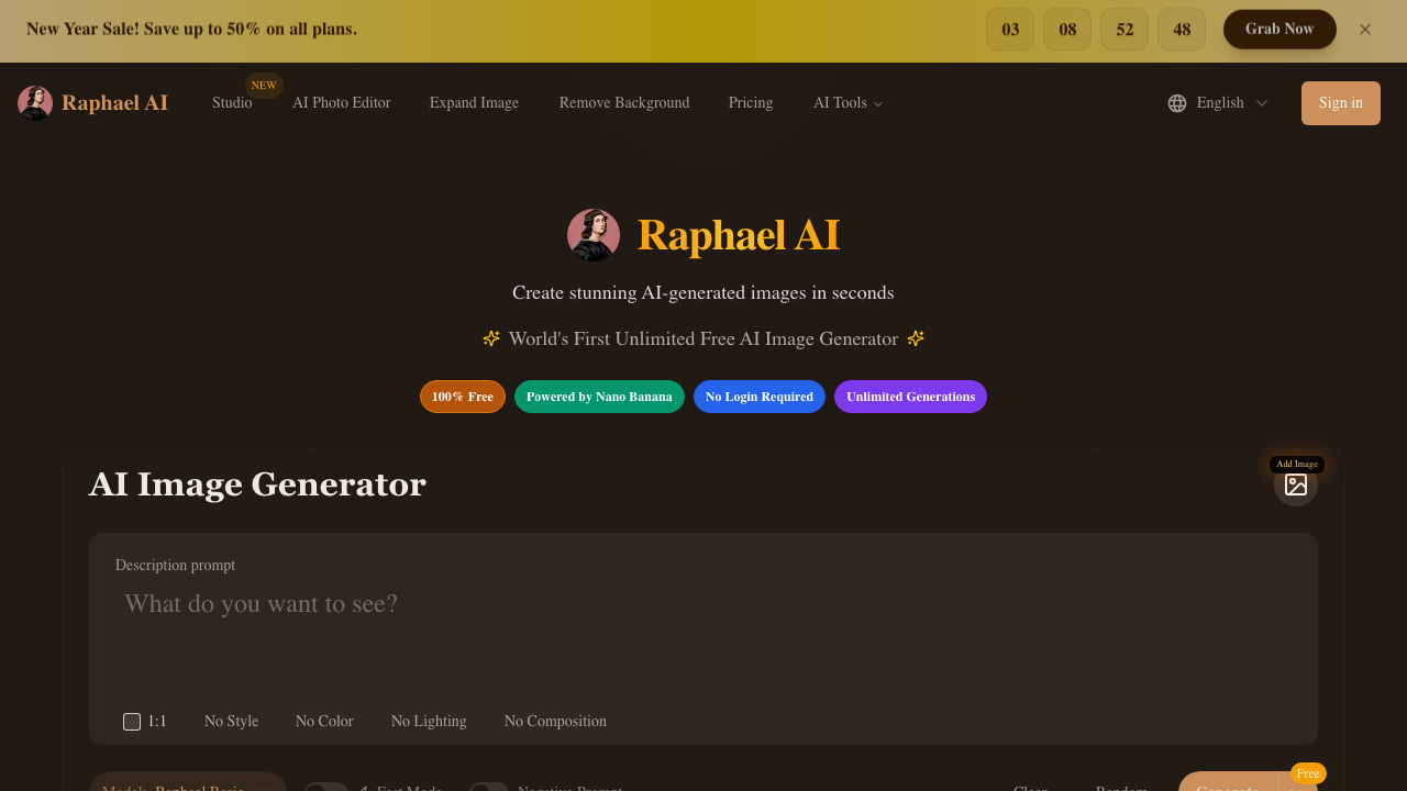 独特优势 Raphael AI最显著的特点是真正意义上的"零门槛"使用体验——既不需要注册账户,也不设置任何生成次数限制,完全免费且无水印。其严格的零数据留存政策确保用户的提示词和生成图像不会被存储在服务器上,这在同类工具中较为罕见。此外,平台基于FLUX.1-Dev模型的快速生成能力,使其在速度和质量上都具有竞争力。