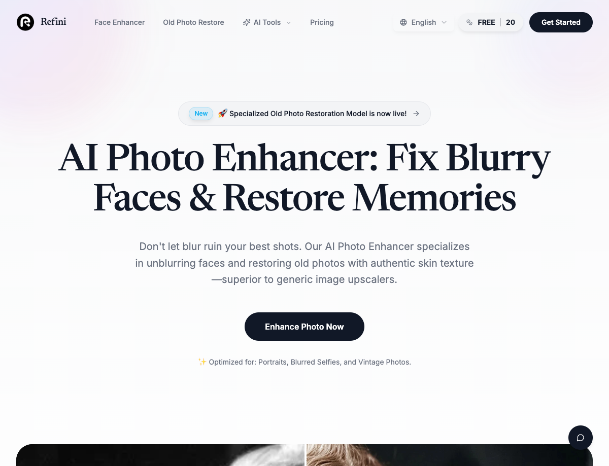 Refini是Aivory Labs推出的AI照片增强平台,专精人像修复——模糊人脸还原、老照片修复、AI上色。与通用图片放大工具不同,Refini的生成式AI专门在人脸数据上训练,能保留真实皮肤毛孔和纹理质感,避免竞品常见的「蜡像感」塑料皮肤效果。