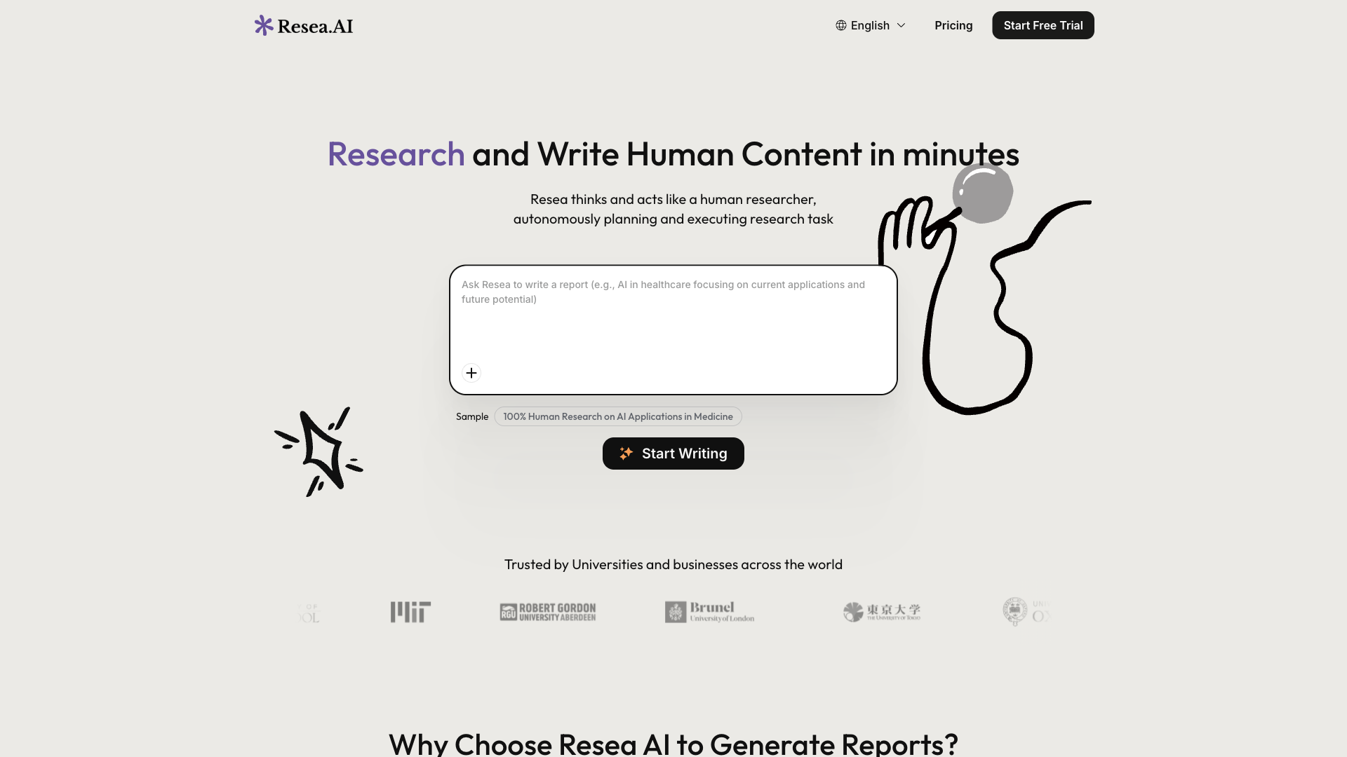 Resea AI 是全球首个自主学术研究代理,能像人类研究员一样独立思考、规划并执行完整的研究任务。不同于通用AI写作工具,它专为学术研究和专业写作设计,直连Google Scholar、PubMed、arXiv等10亿+学术论文库,可生成长达50,000字的学术报告并通过主流AI检测器。