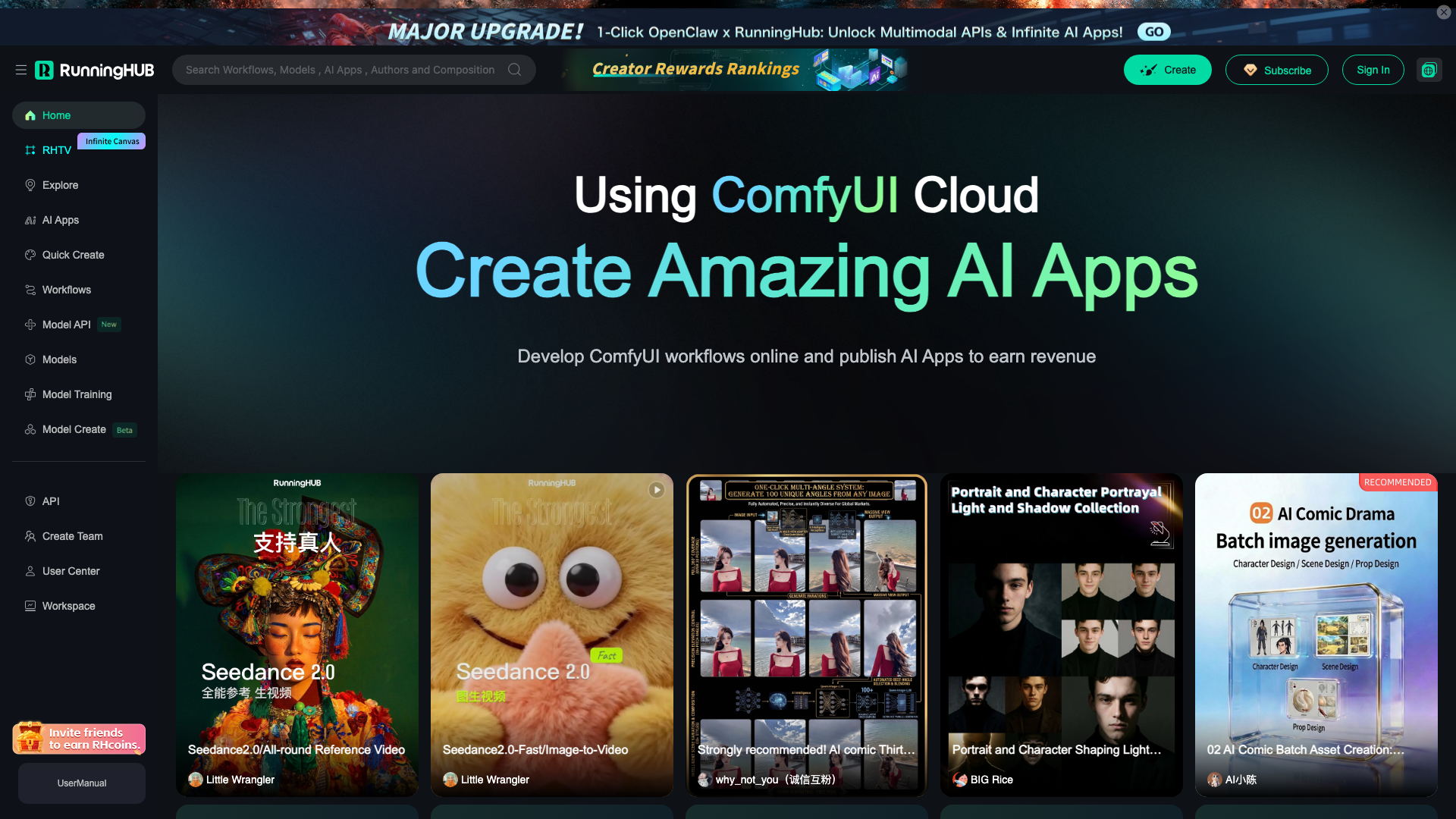 RunningHub 采用免费增值模式,新用户注册即获免费积分,无需信用卡。正式使用为积分订阅制,Personal 方案 $9.99/月起,含 50,000 credits。