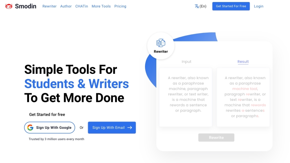 Smodin是一个AI驱动的写作助手平台,提供重写、抄袭检查、引用、翻译等多种工具,帮助用户提升写作质量、确保原创性并简化写作流程。Smodin被超过1,000万学生、作家和专业人士使用,在全球180多个国家提供服务。