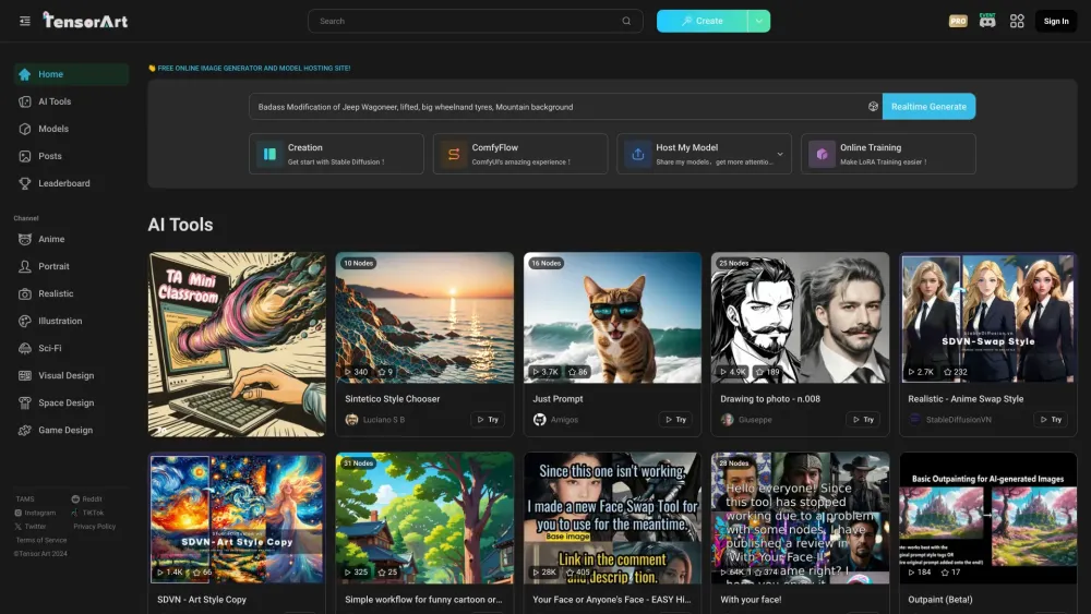 Tensor.Art是一个免费的在线AI图像生成器和模型托管平台,为用户提供强大的AI艺术创作工具。该平台支持多种AI模型,允许用户轻松生成高质量的艺术图像。