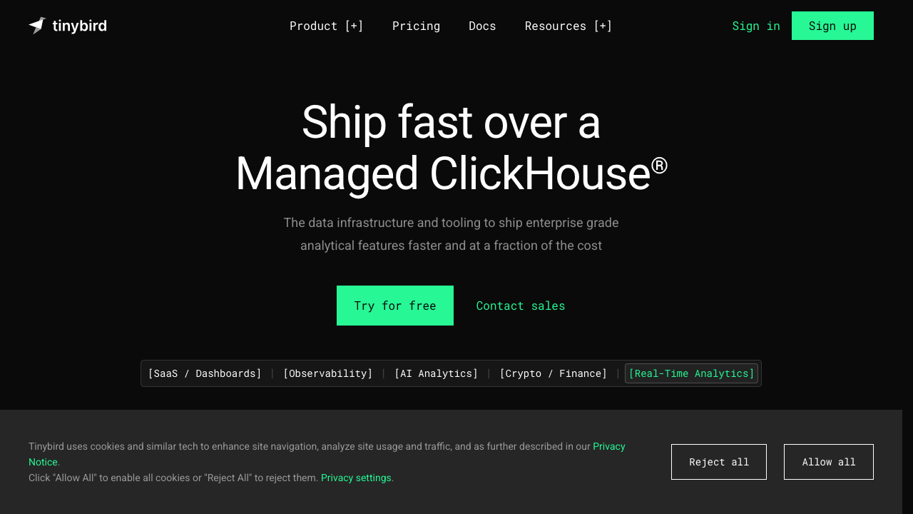 Tinybird 是一个专为开发者打造的 Serverless 实时数据分析平台,被称为“数据领域的 Vercel”或“ClickHouse 版的 Supabase”。它允许团队在免除底层基础设施运维的前提下,通过简单的 SQL 快速摄取海量数据流,并一键将其发布为生产级的高性能低延迟 REST API。这极大地赋能了需要快速构建面向用户的数据产品的开发团队。