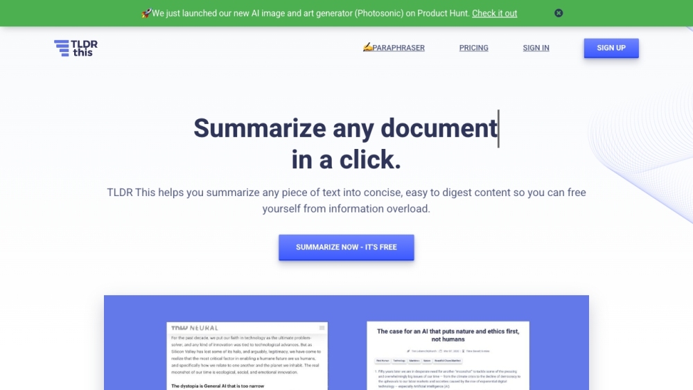 TLDR This 是一款 AI内容创作,免费AI驱动的文章摘要和文本总结工具。