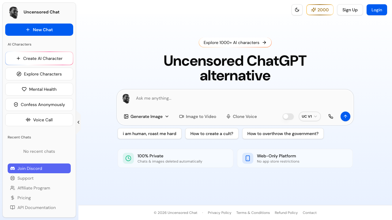 独特优势 与 Character.AI 或 Chai 等竞品相比,Uncensored Chat 通过纯网页端策略实现了彻底的零审核,其独特的24小时数据自动销毁机制在同类产品中更是罕见,真正做到了“开箱即用”且安全无痕。