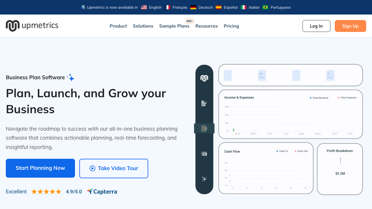 独特优势 与LivePlan等传统重度测算软件相比,Upmetrics 将重心放在了起步期的敏捷产出与AI自动化赋能上。它是少有能将“写计划书”、“财务建模”和“路演排版”全链路真正打通的现代协作型平台,在易用性和融资导向性上优势显著。