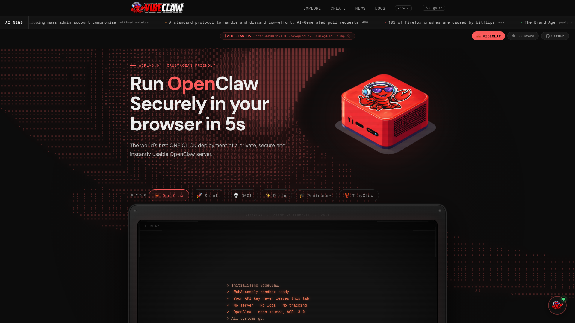 VibeClaw 是基于 OpenClaw(GitHub 超24万星)框架构建的浏览器原生 AI 编程代理平台,无需安装任何软件,3秒内即可在浏览器启动完整的 Agent 运行时。它是目前 OpenClaw 生态中摩擦最低的入口,面向希望快速体验 AI 编程代理的开发者和已在使用 OpenClaw 的团队。