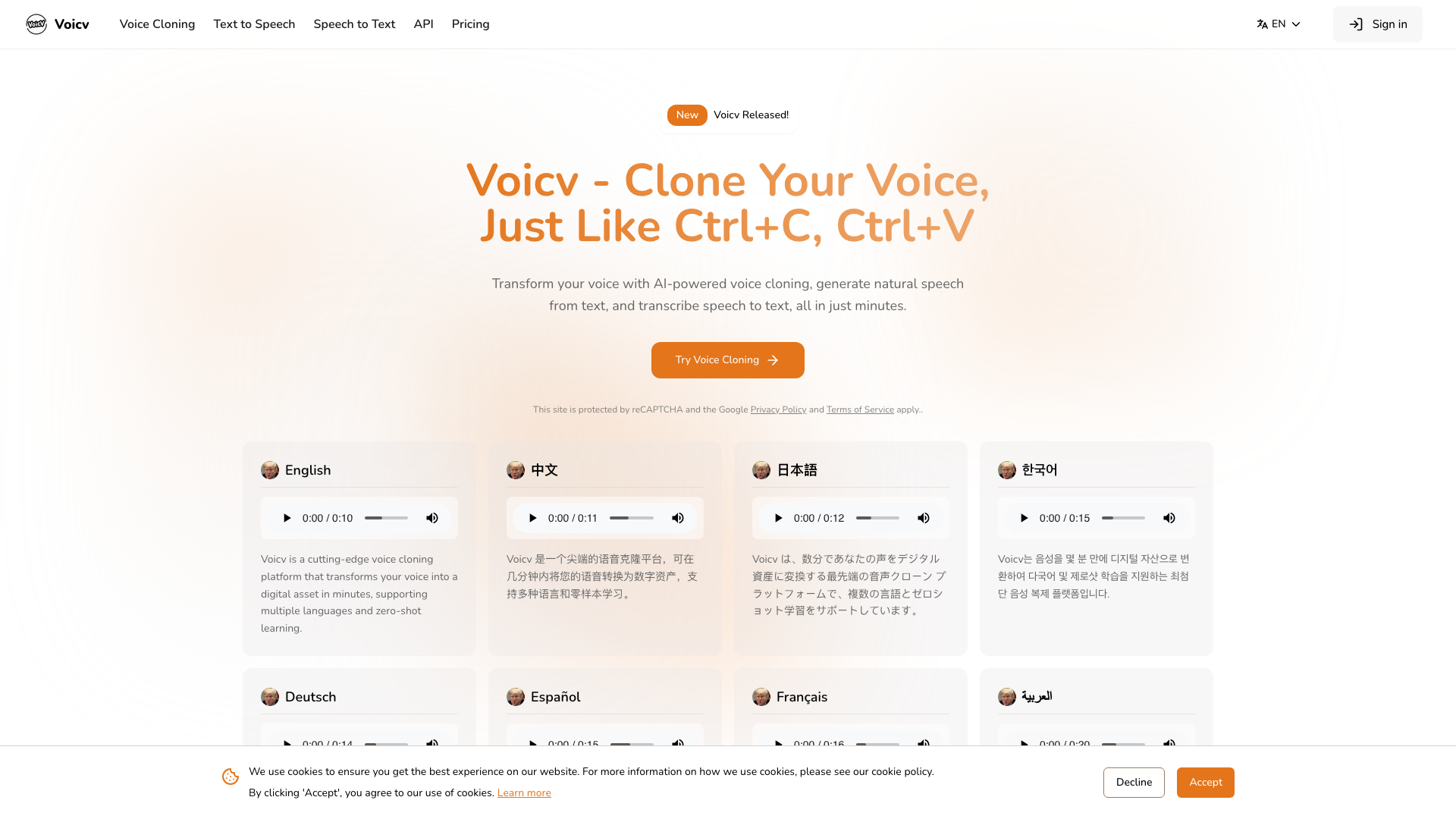 Voicv 是一款主打「像复制粘贴一样简单」的 AI 语音克隆平台,仅需 10-30 秒音频样本即可生成高保真数字语音副本。采用零样本学习技术,无需繁琐训练过程,让普通创作者也能轻松掌握专业级语音克隆能力。