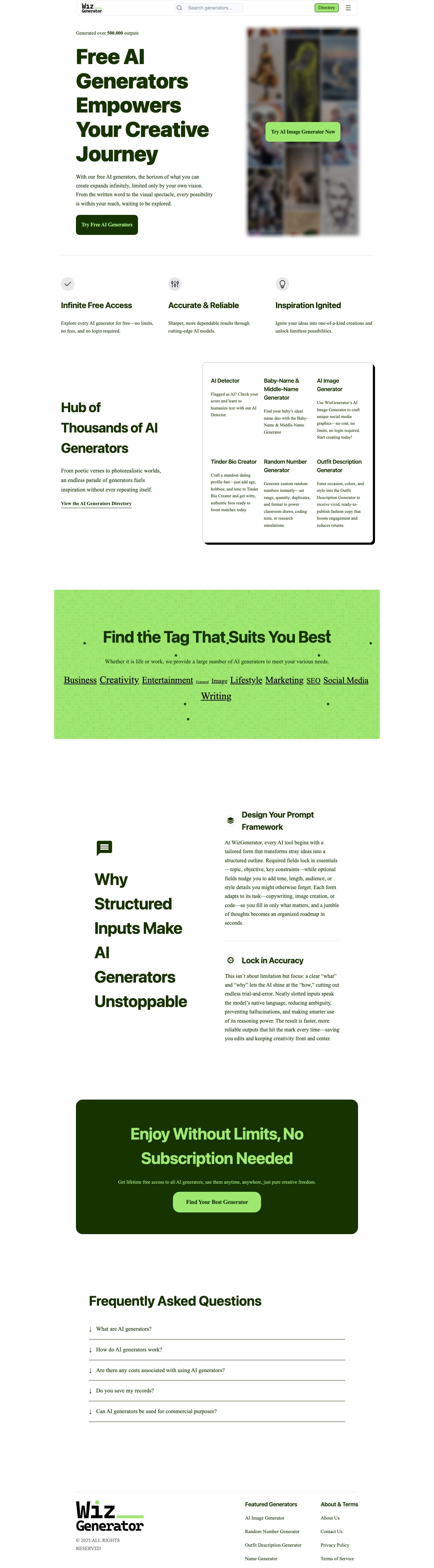 WizGenerator 是一款主打“零门槛”的免费 AI 工具聚合平台,为普通用户、营销人员和创作者提供海量即开即用的灵感辅助工具。它无需注册、免订阅且完全免费,是你的轻量级 AI 百宝箱。