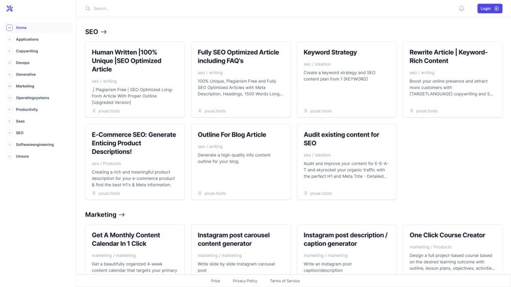 You Ai Tools集成了多种AI工具,覆盖了从内容创作到营销优化的各个方面,为用户提供一站式的AI解决方案。